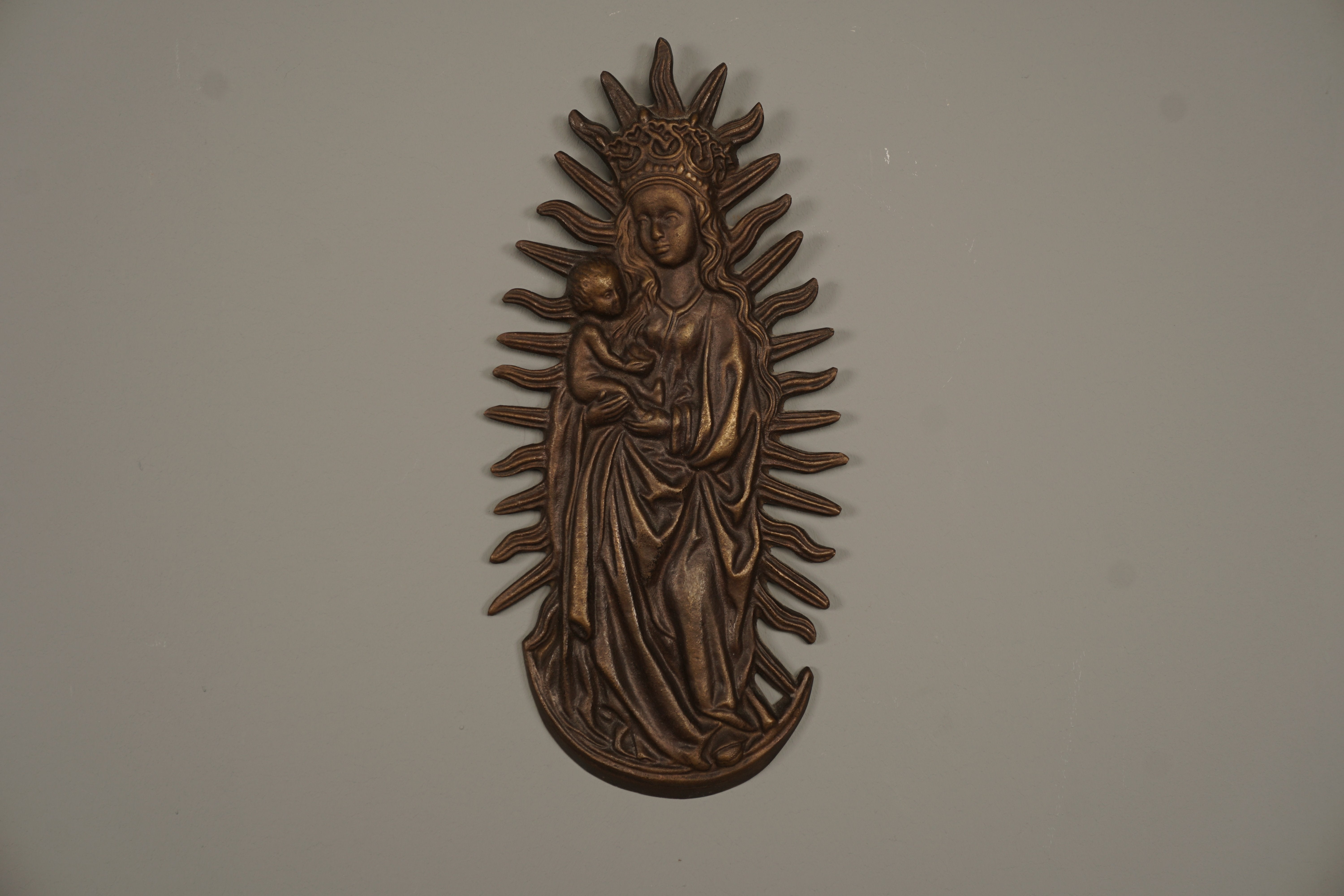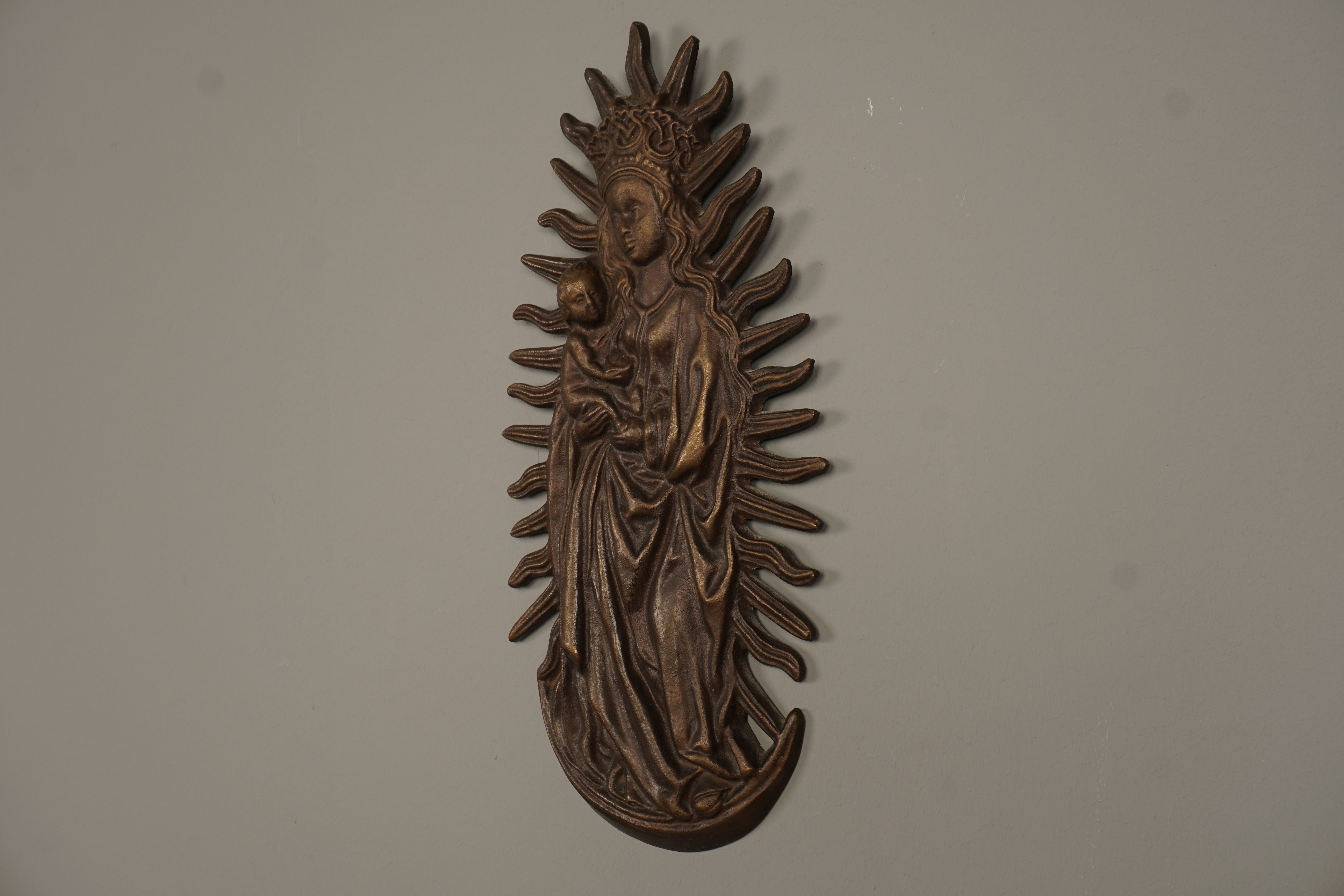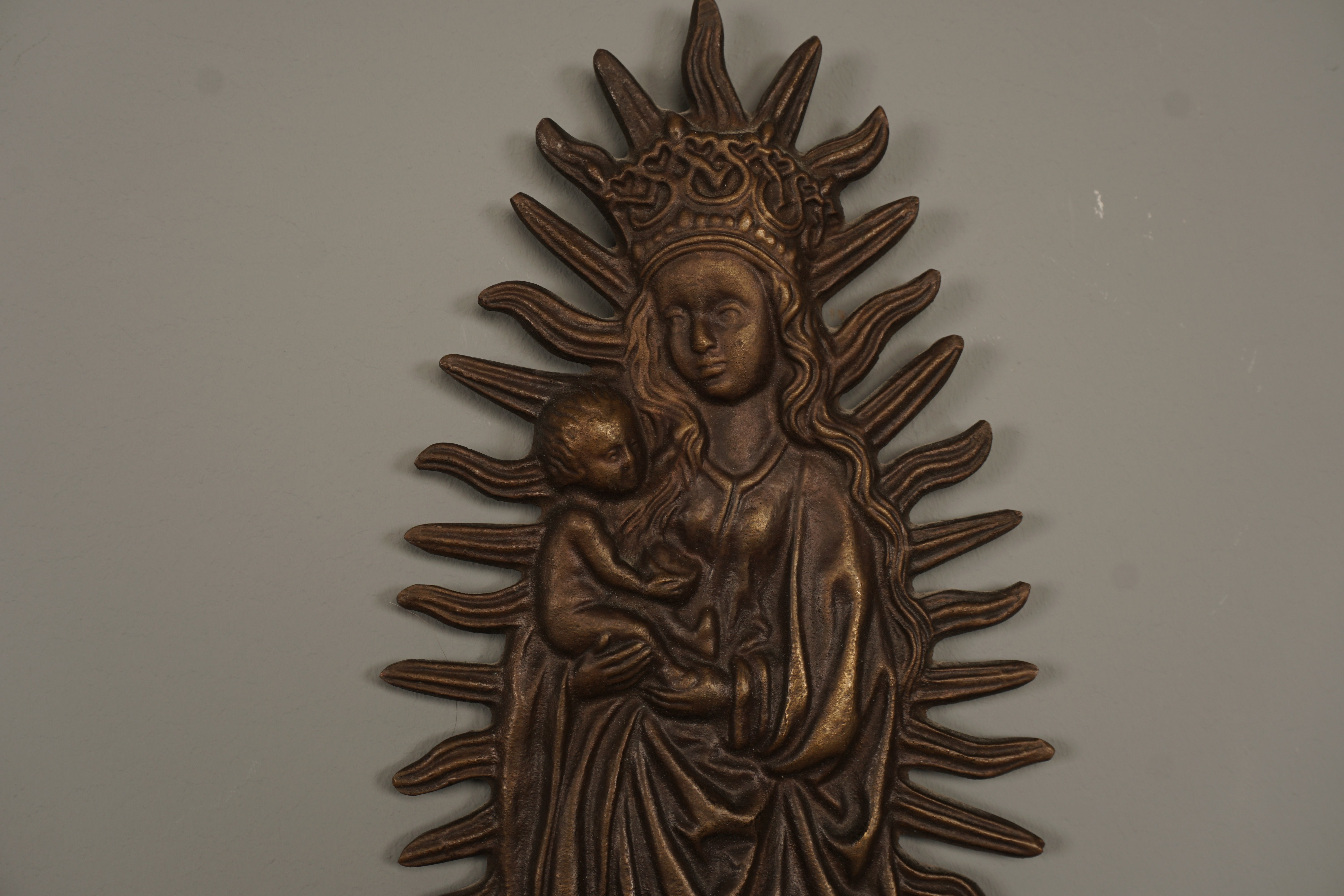 This stunning bronze wall relief from the 1960s features a Marian image with the Christ Child in a halo. It's a beautiful example of Victorian art and craftsmanship.
