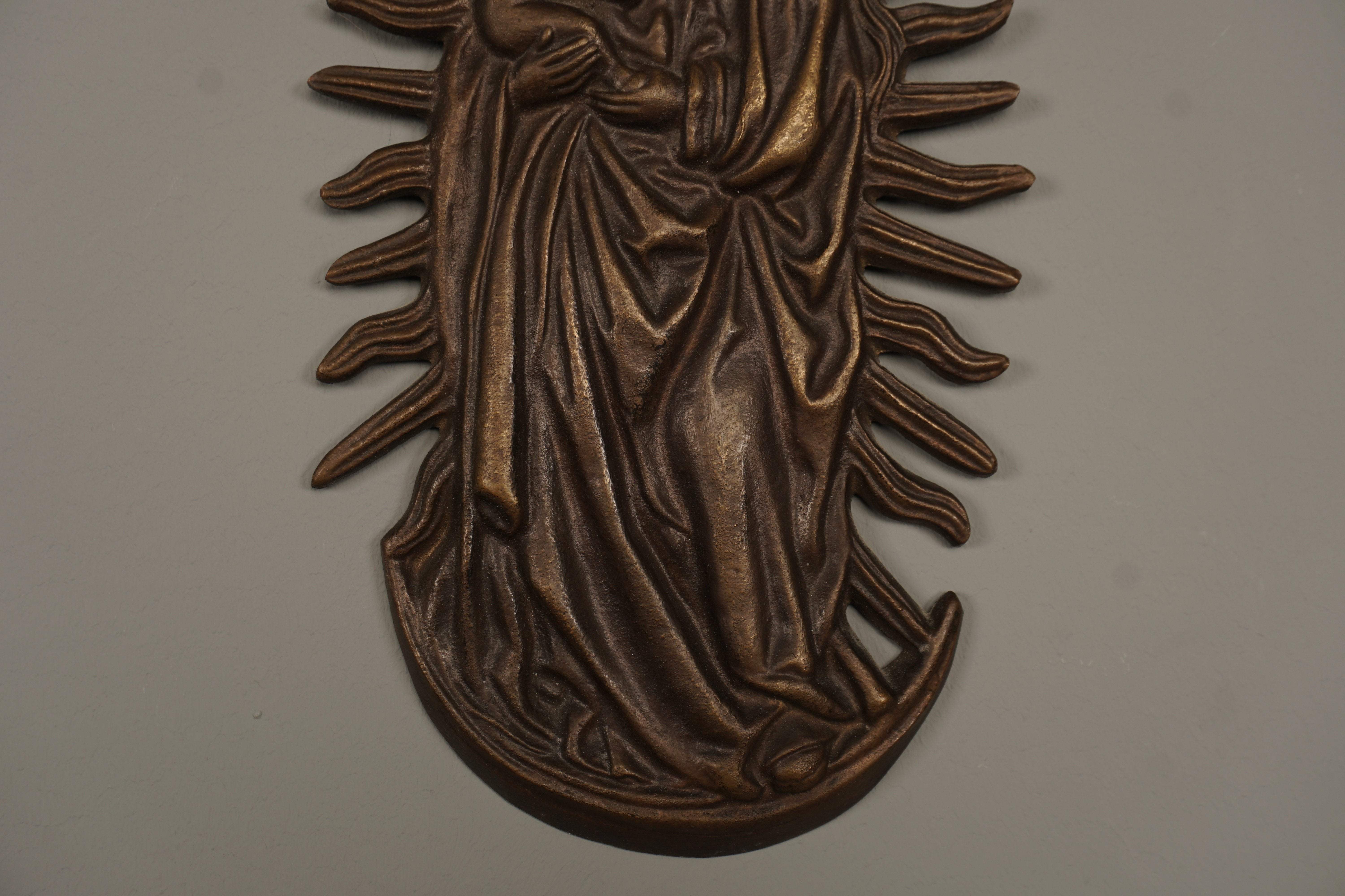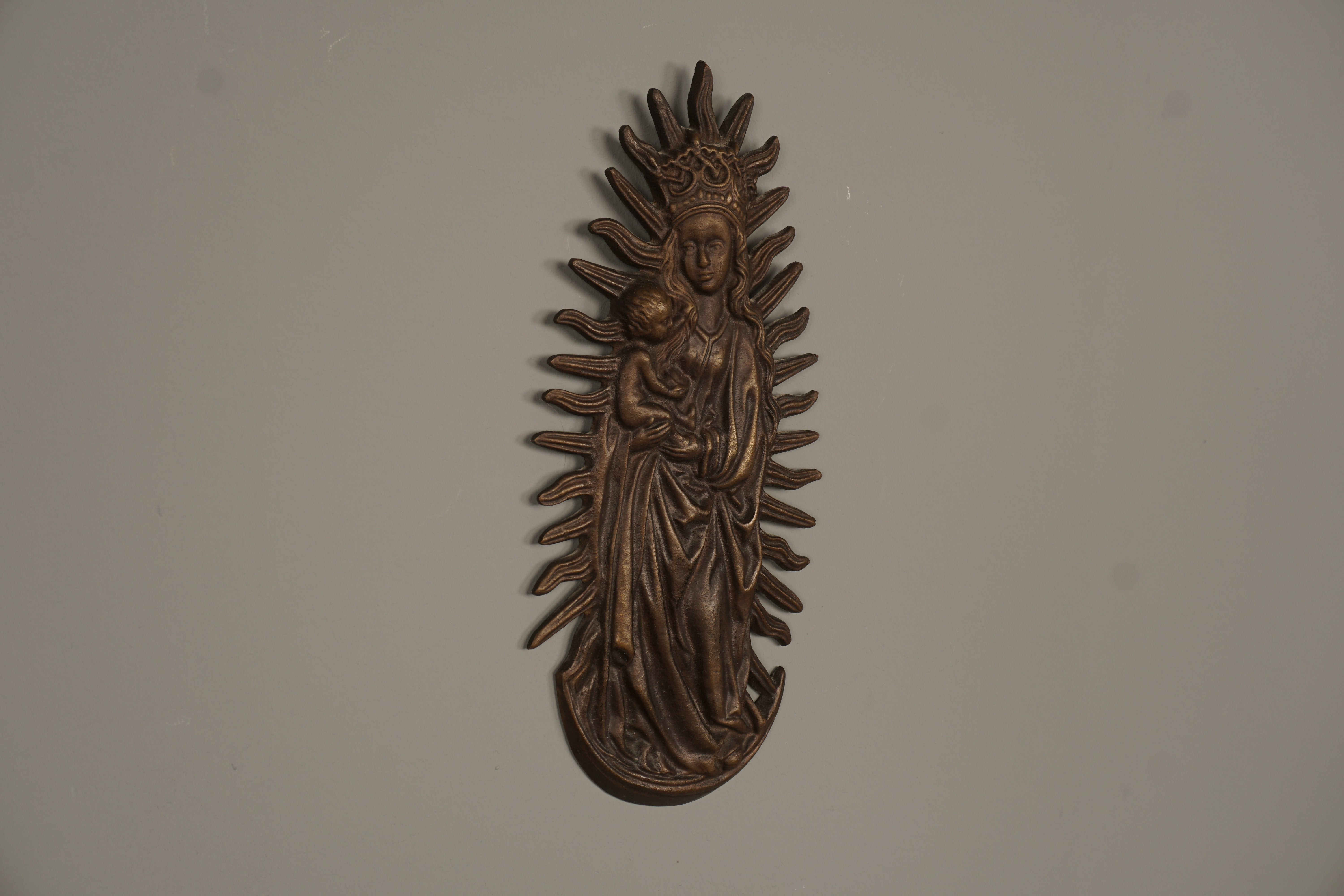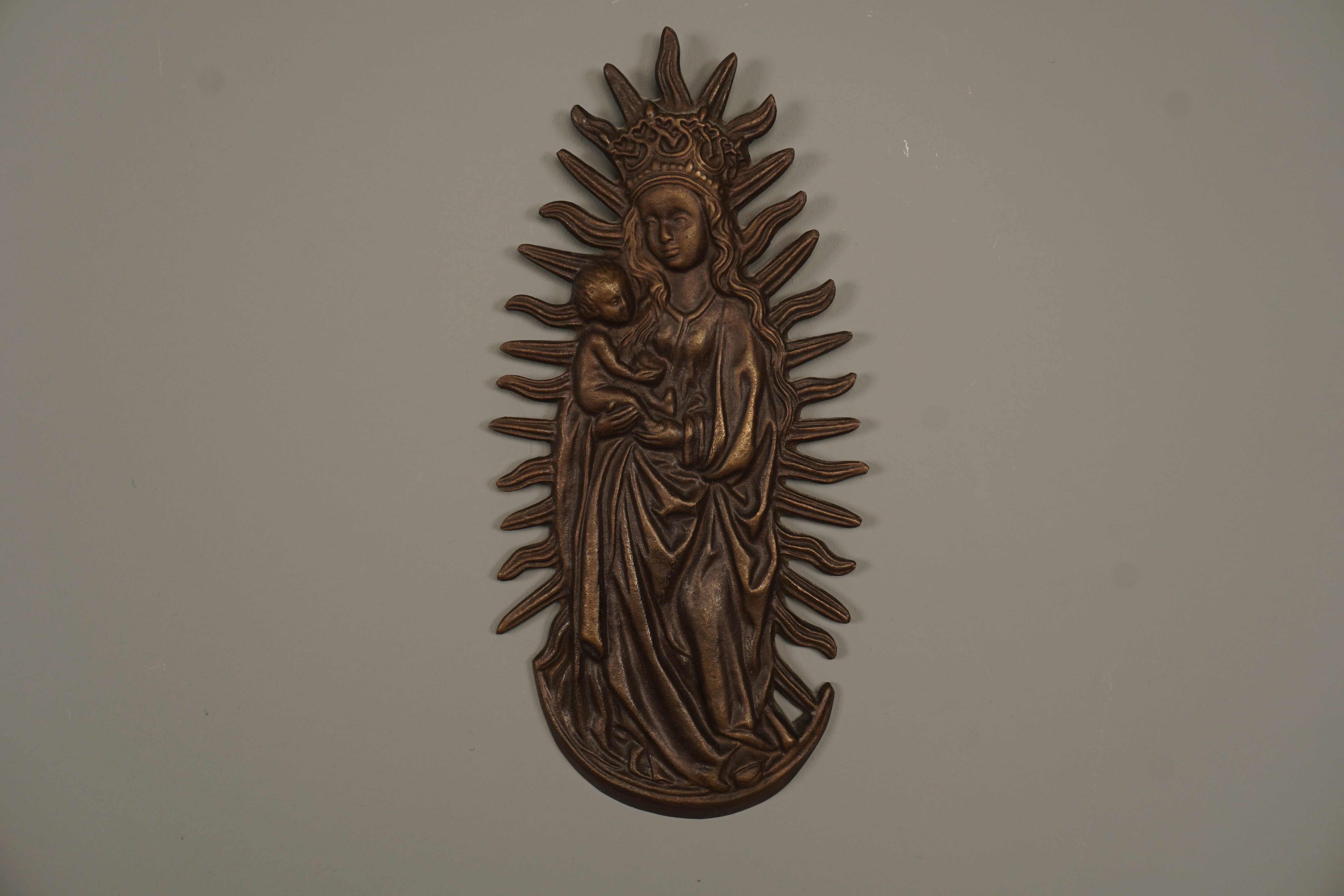 This stunning bronze wall relief from the 1960s features a Marian image with the Christ Child in a halo. It's a beautiful example of Victorian art and craftsmanship.