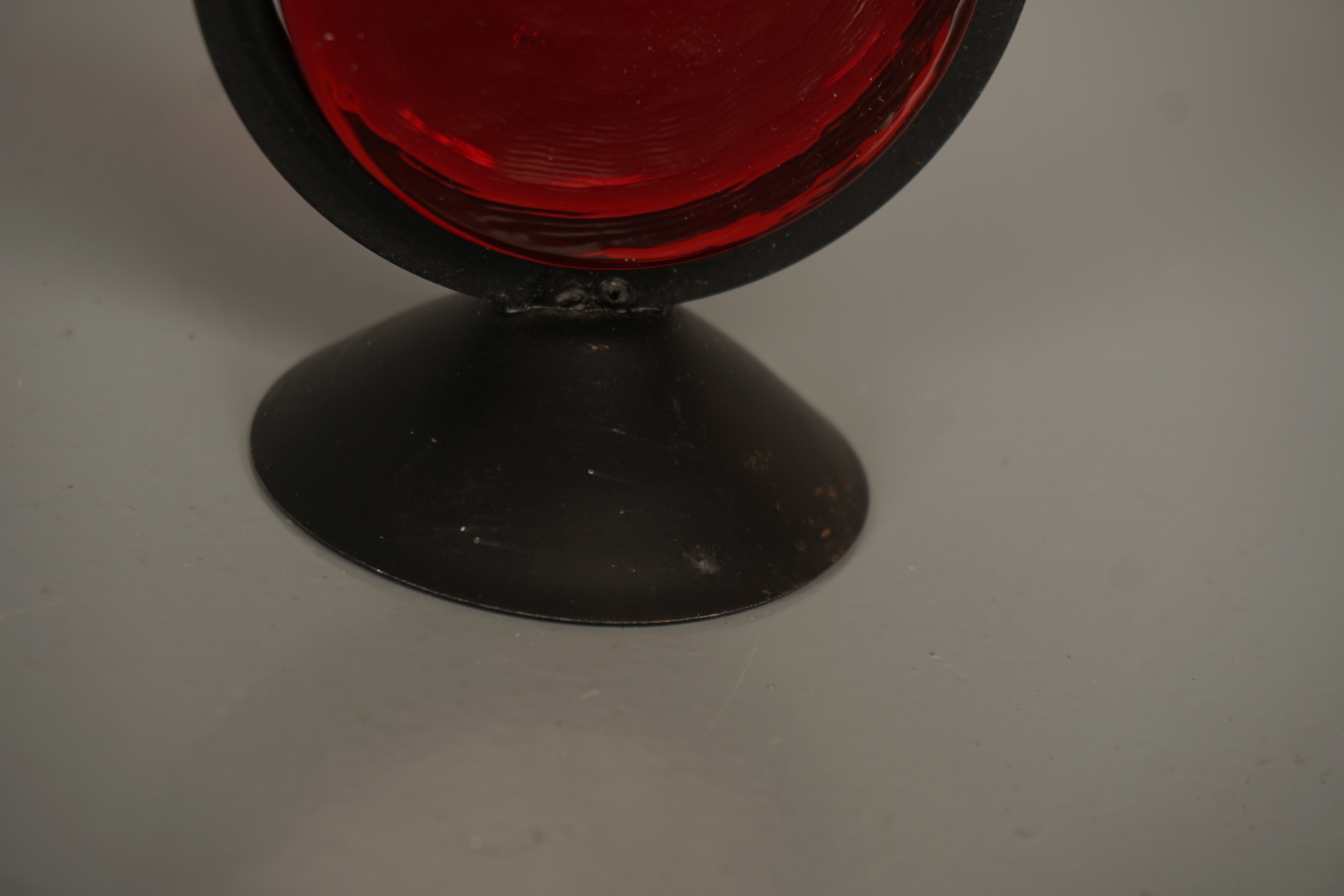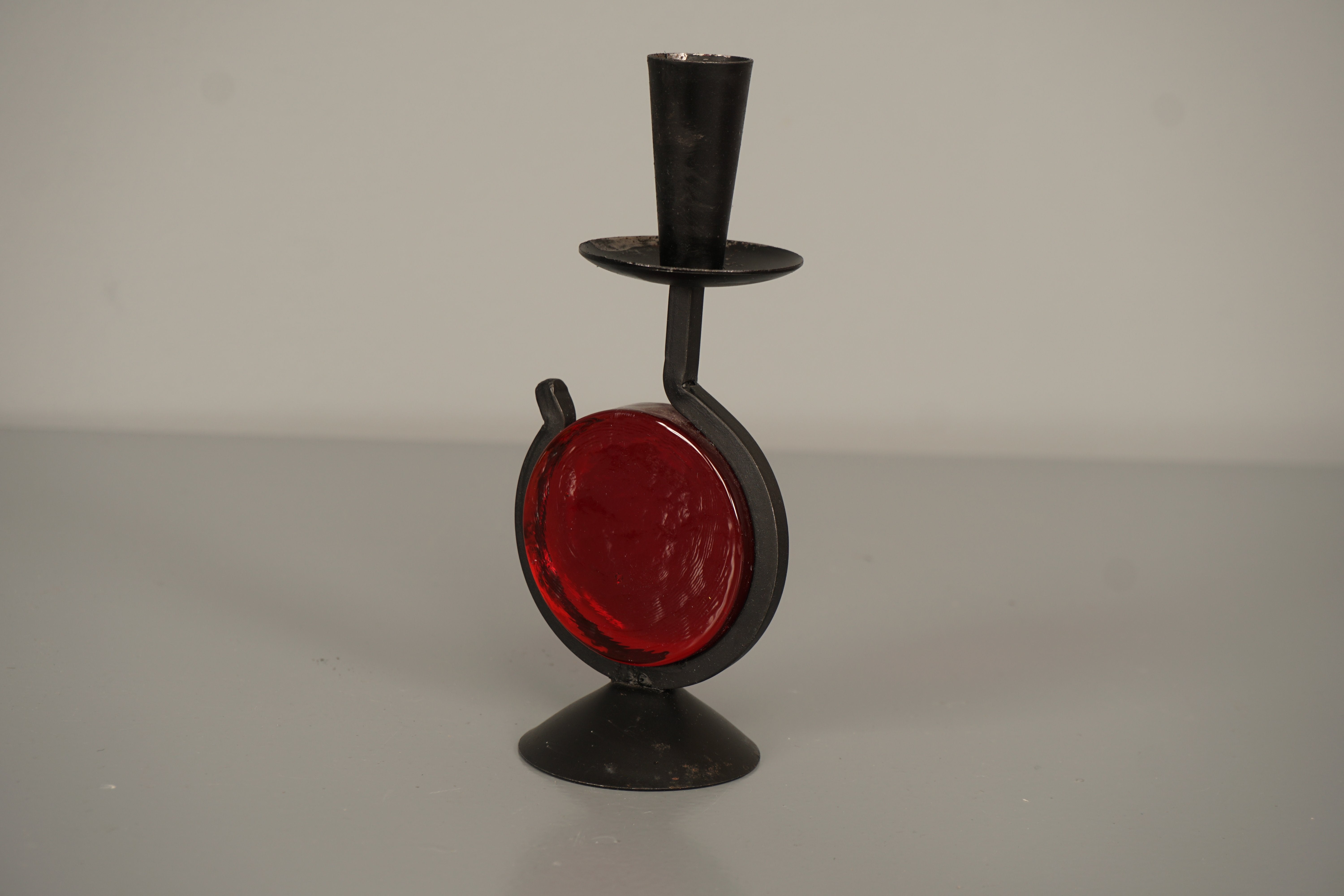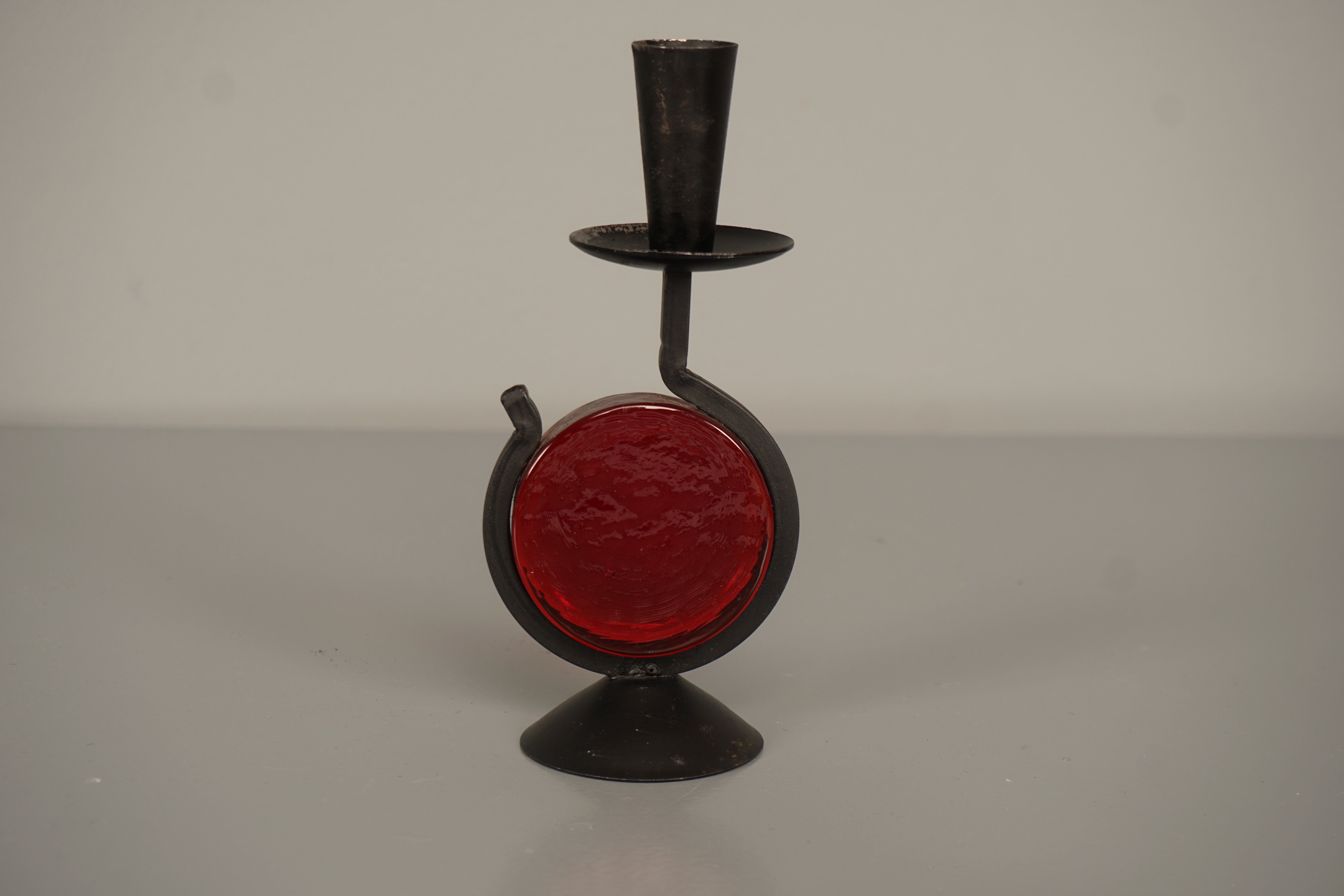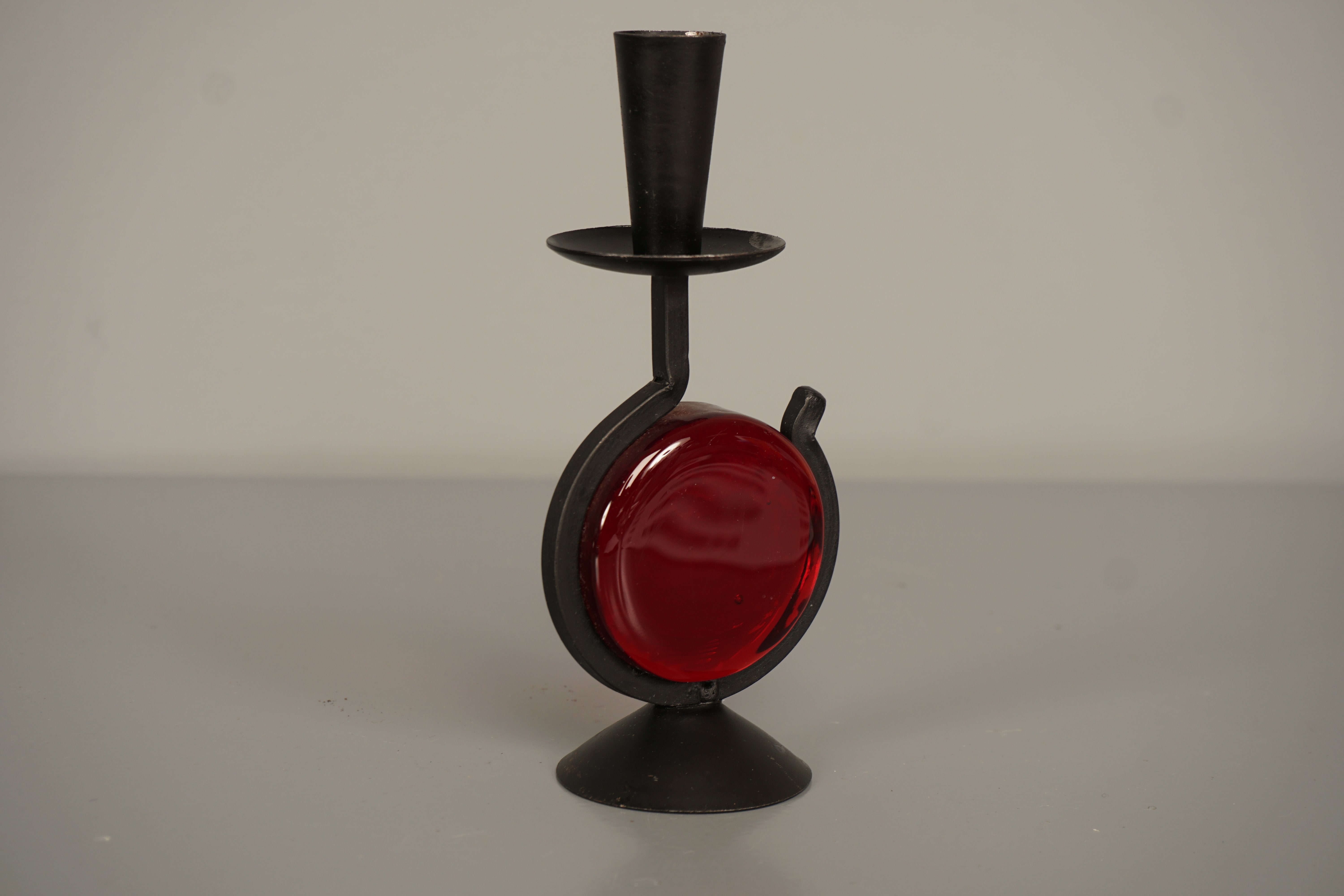 This candle holder is a typical example of Swedish Mid-Century Modern design. The red glass component adds a special charm, while the black metal provides a sturdy base.