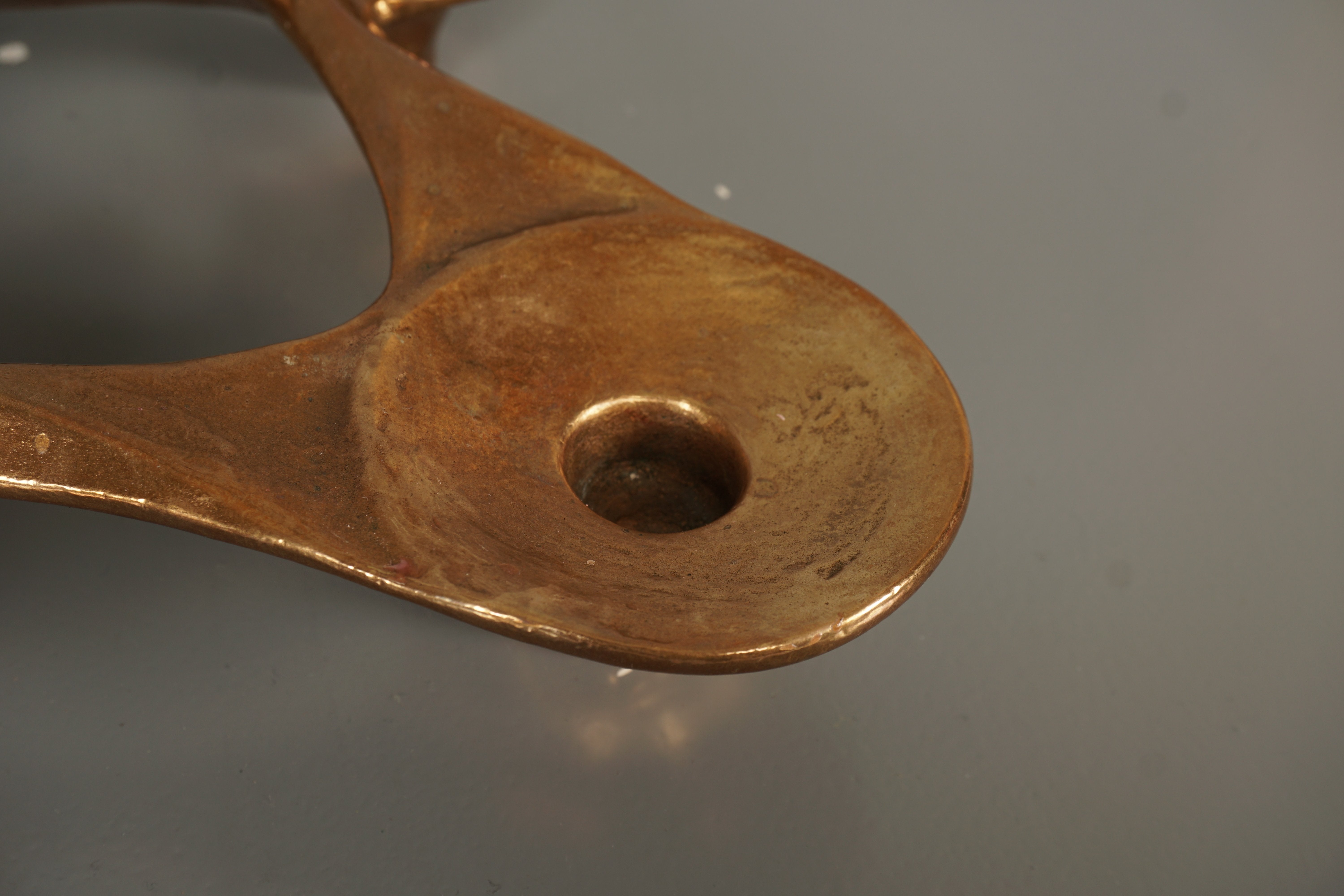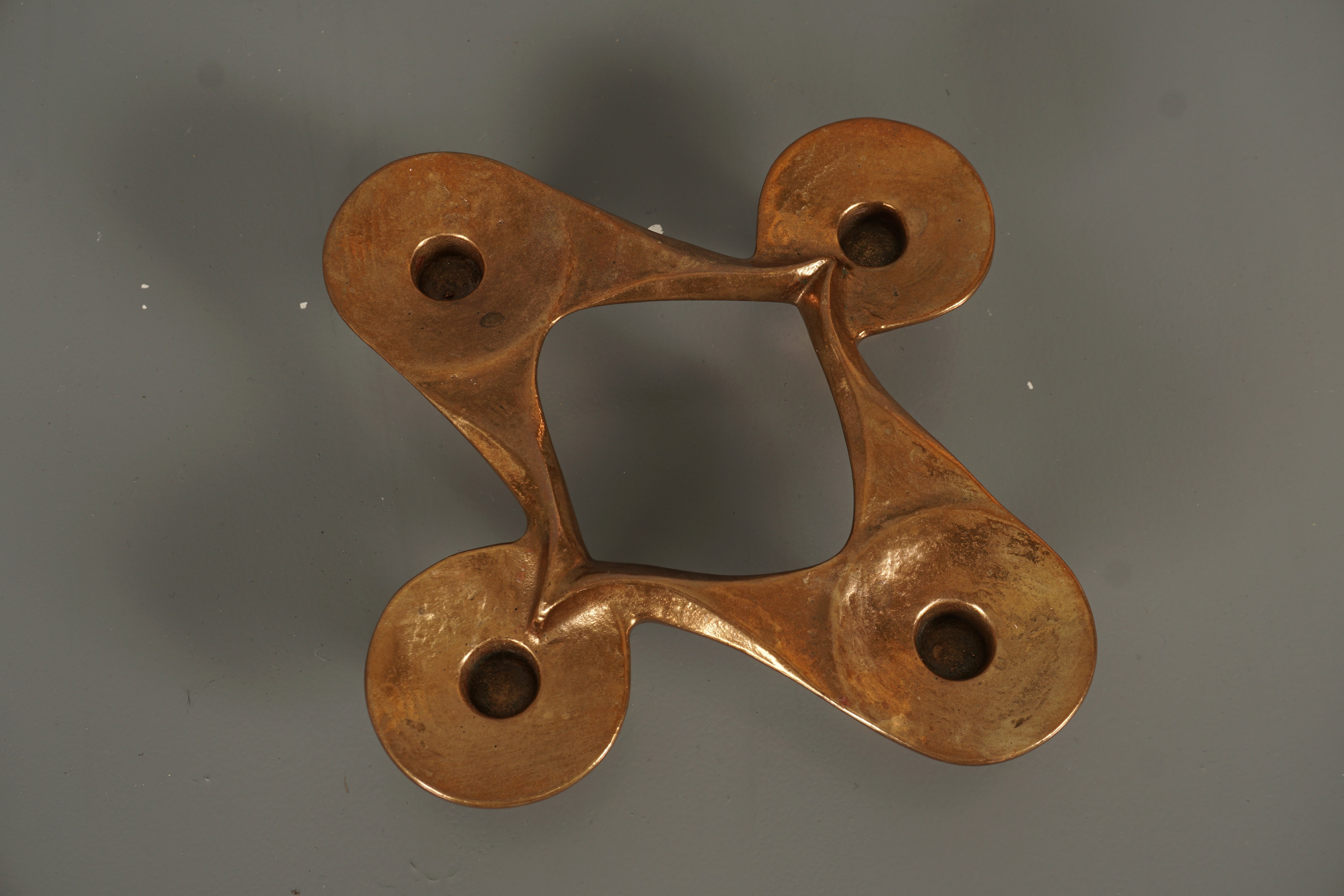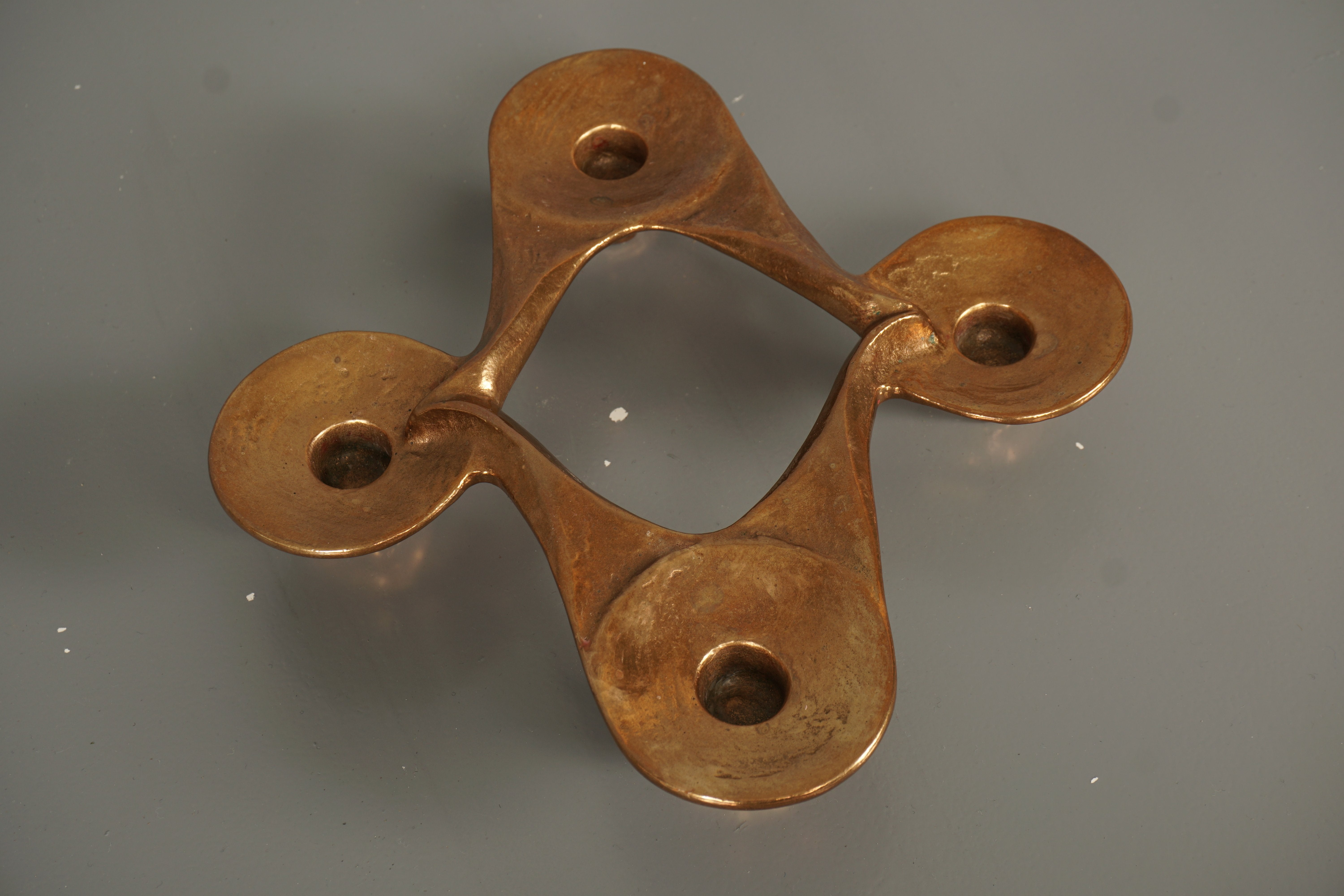 The characteristic bronze look makes this Harjes candle holder from the 60s a real eye-catcher. With dimensions of 26 cm in width and 5 cm in height, it accommodates multiple candles, adding a touch of mid-century modern elegance to any room. Made from high-quality metal, the candle holder is in very good condition, perfect for lovers of vintage decor.