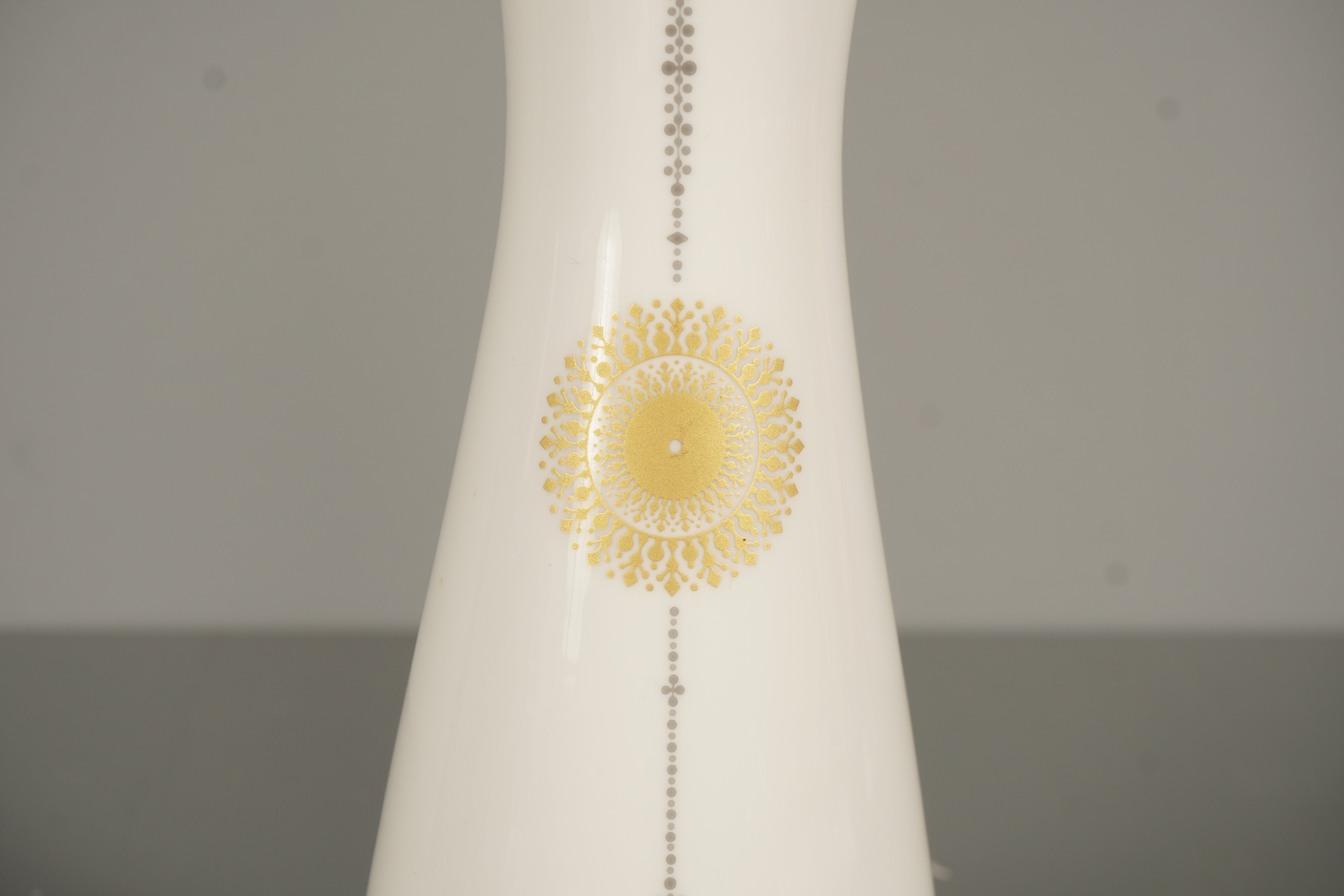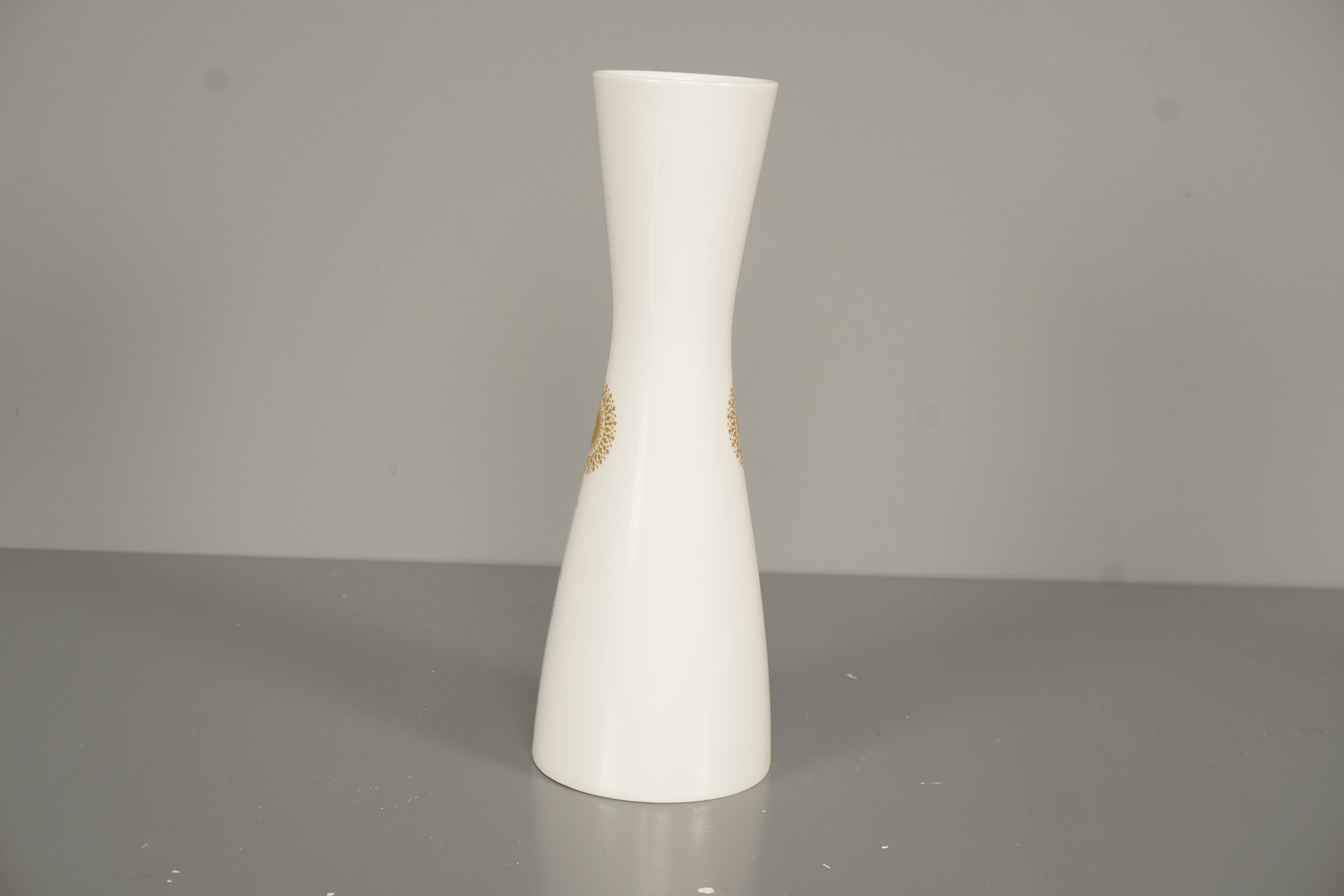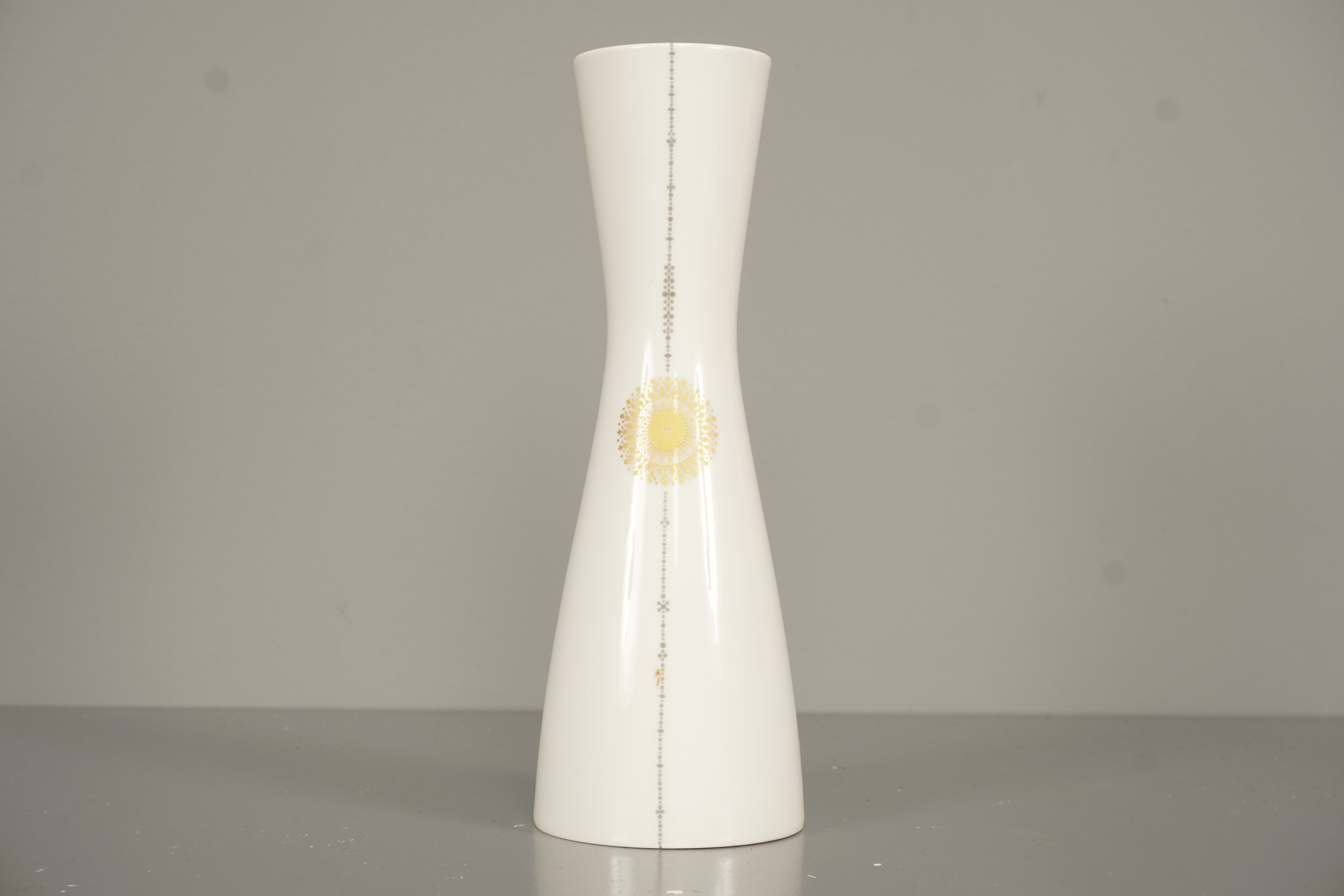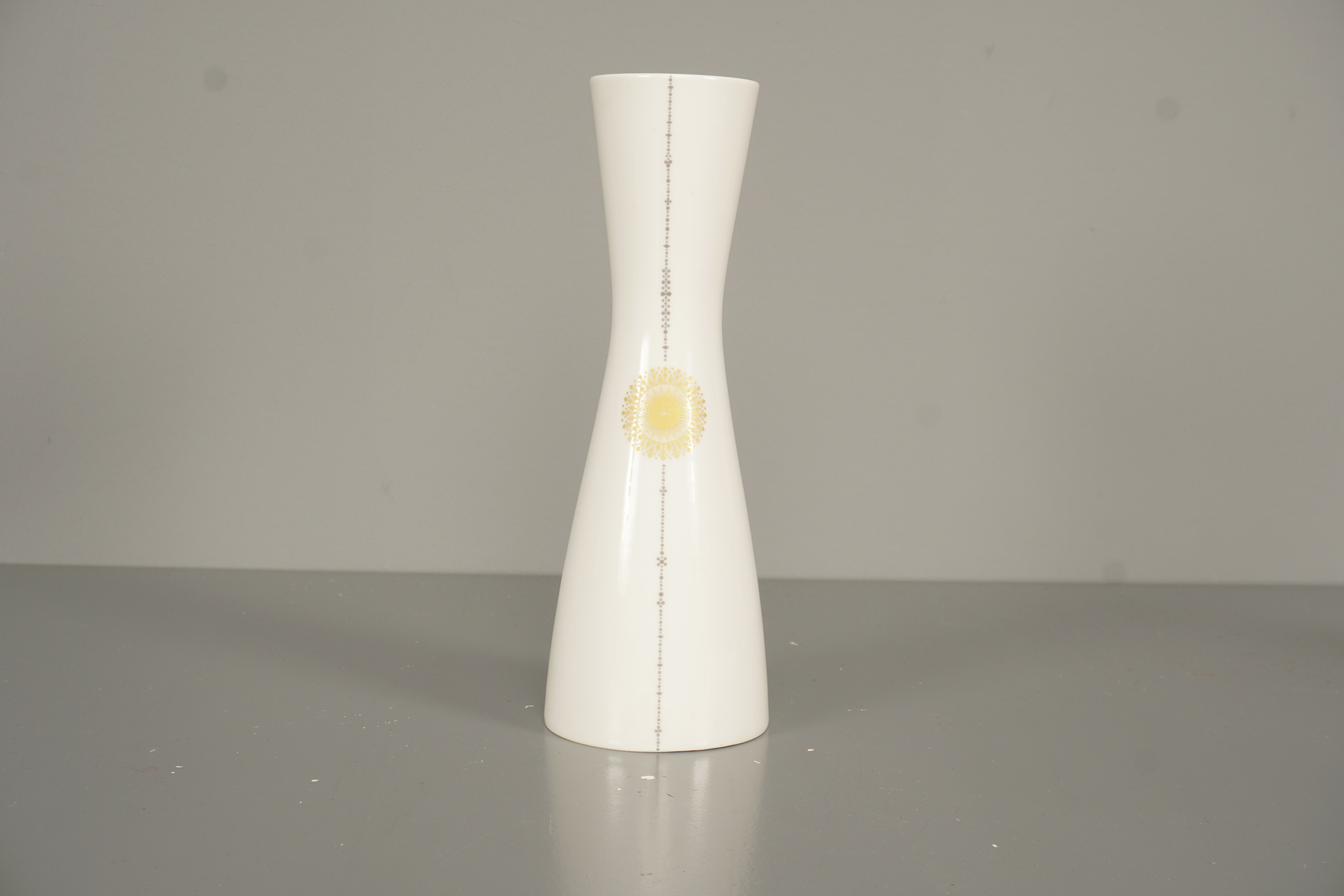 The characteristic shape of this Rosenthal Studio-Line vase from the 1980s makes it a true highlight for your home. Standing 25.5 cm tall and 9 cm wide, it's perfect for floral arrangements or as a decorative piece. The combination of white porcelain and gold accents gives it an elegant touch. In very good condition, it's a must-have for mid-century modern style enthusiasts.
