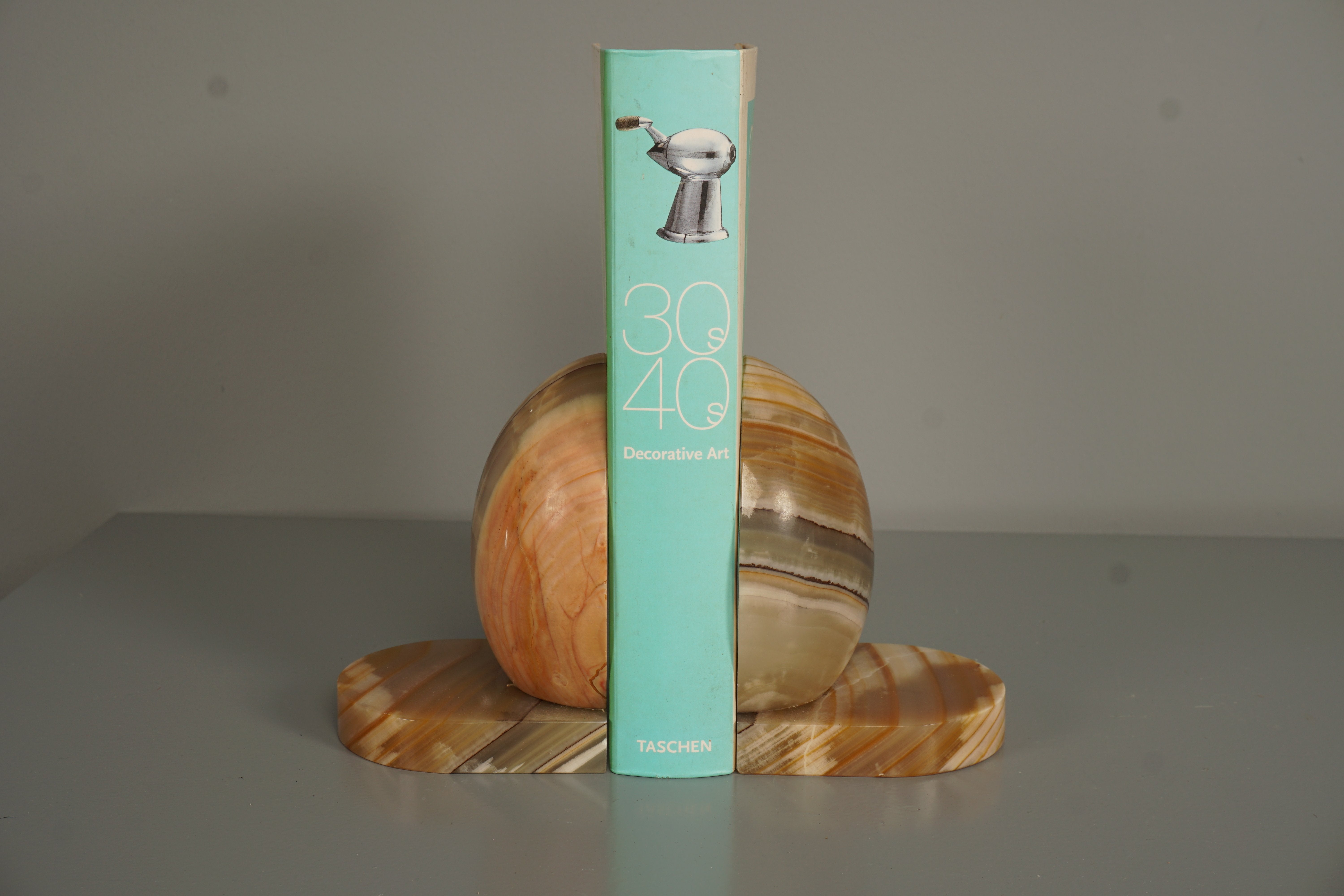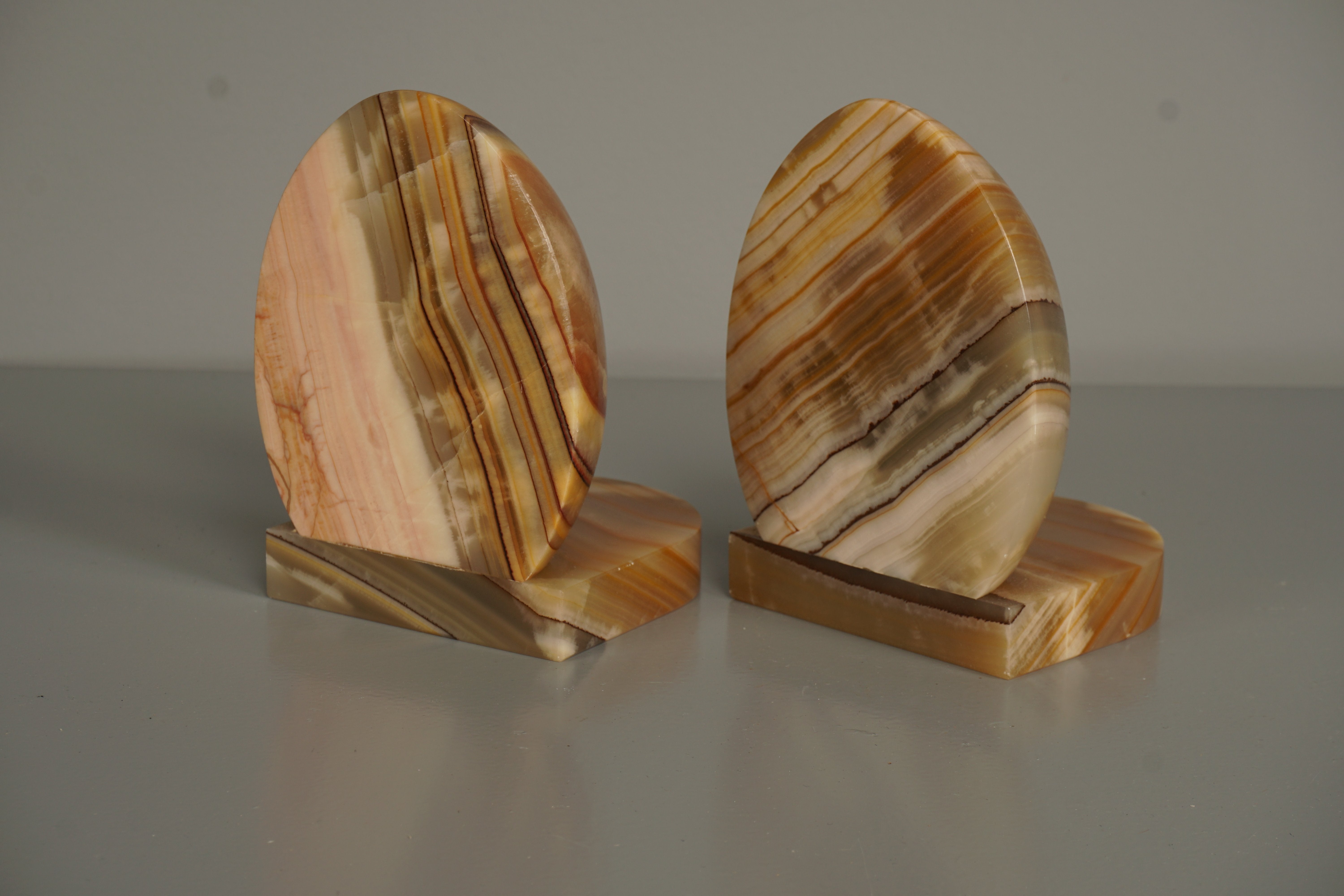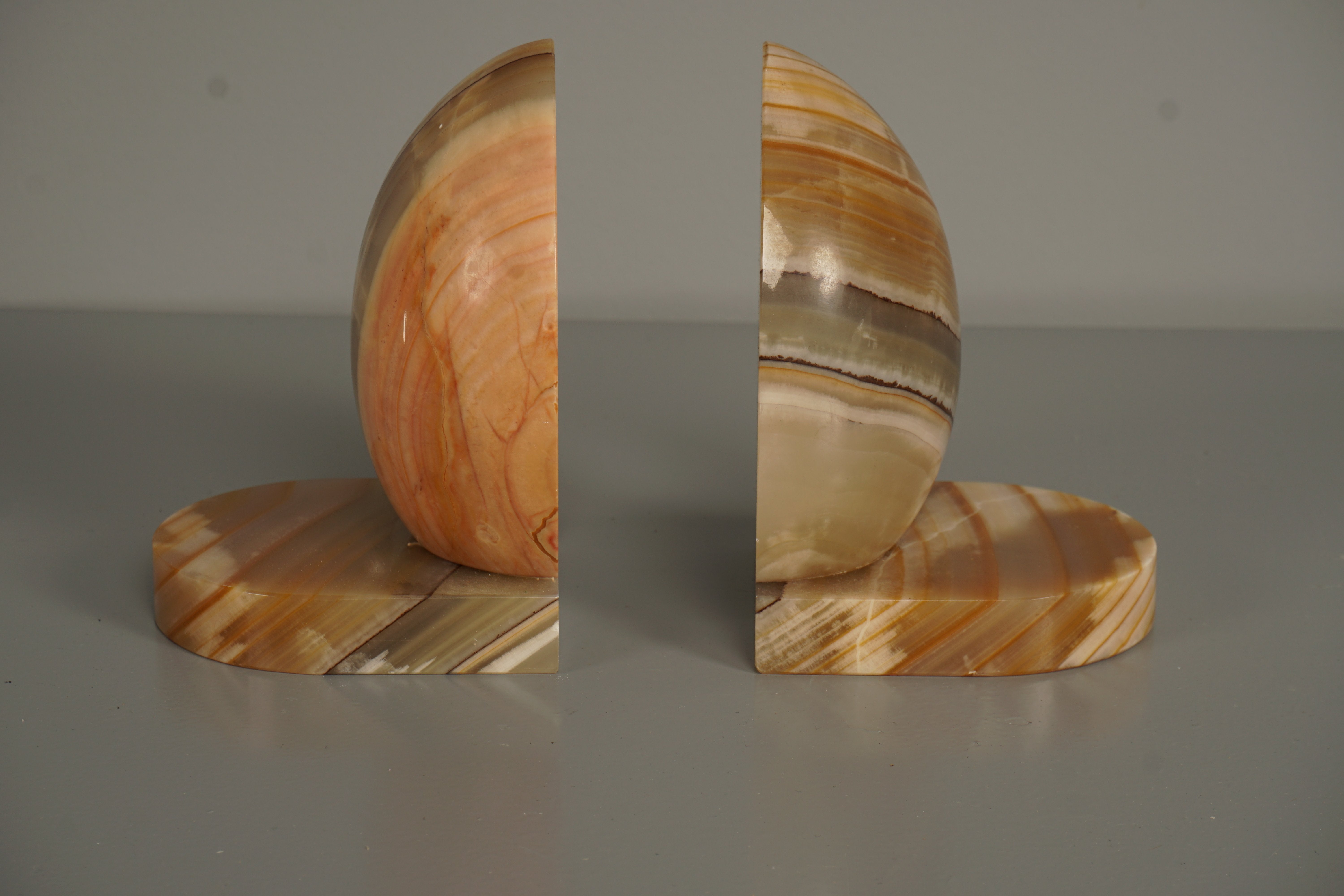 Unique agate bookends from the 1970s, polished to perfection. These decorative pieces are perfect for any bookshelf, adding a touch of mid-century modern style to your home.
