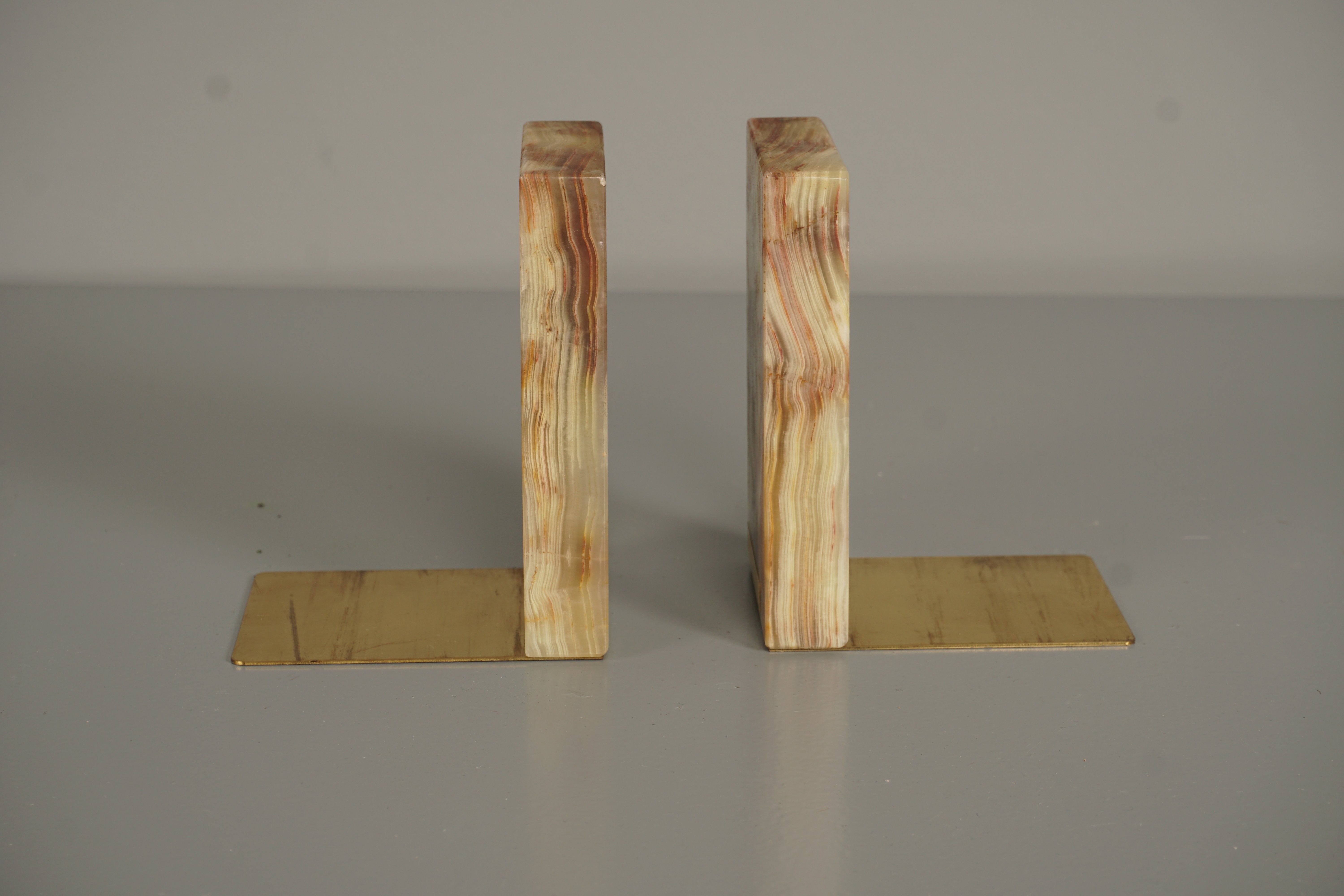 Experience the elegance of the 1970s with this vintage pair of marble-onyx polished bookends. The unique grain and brass base add a touch of luxury to any bookshelf.