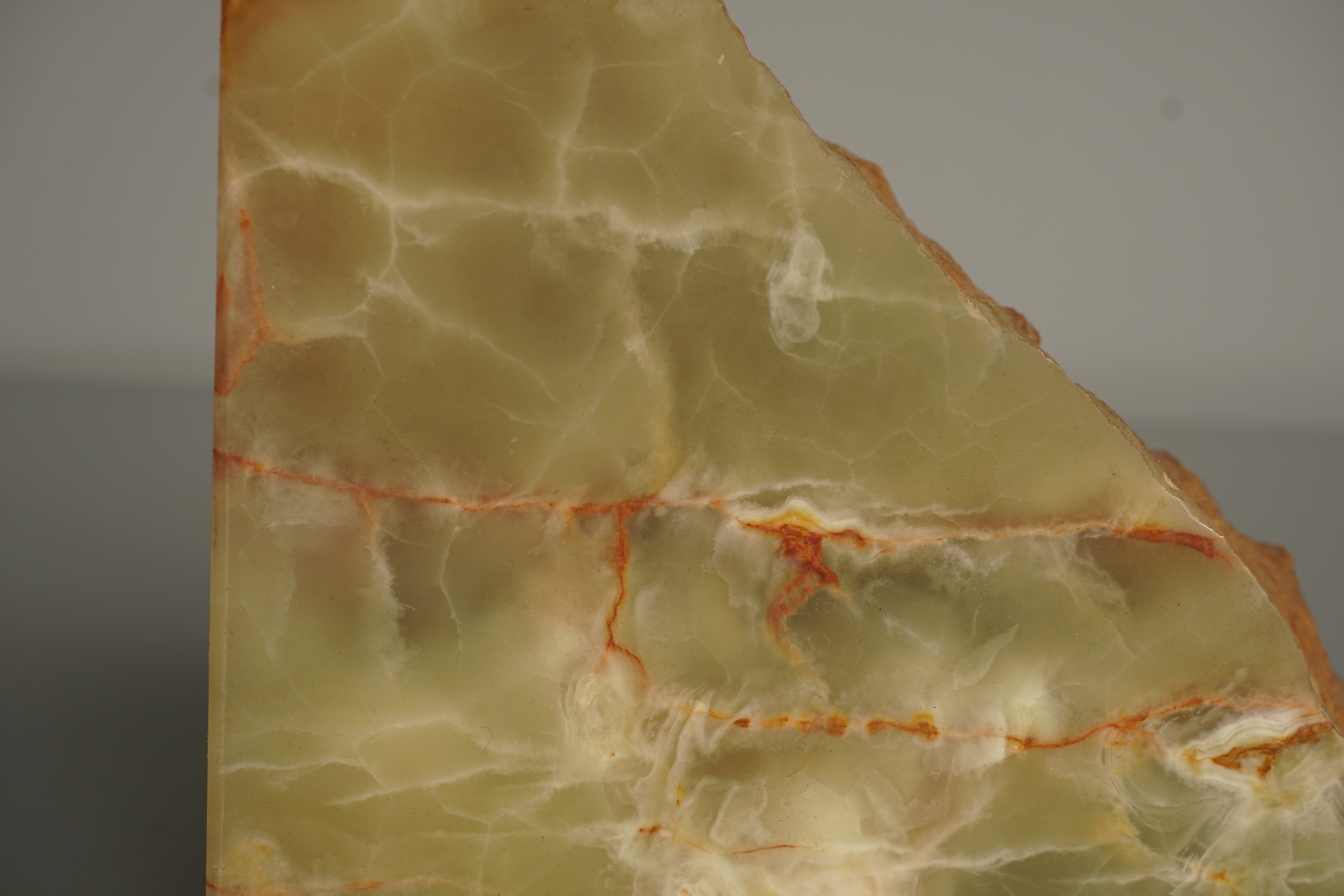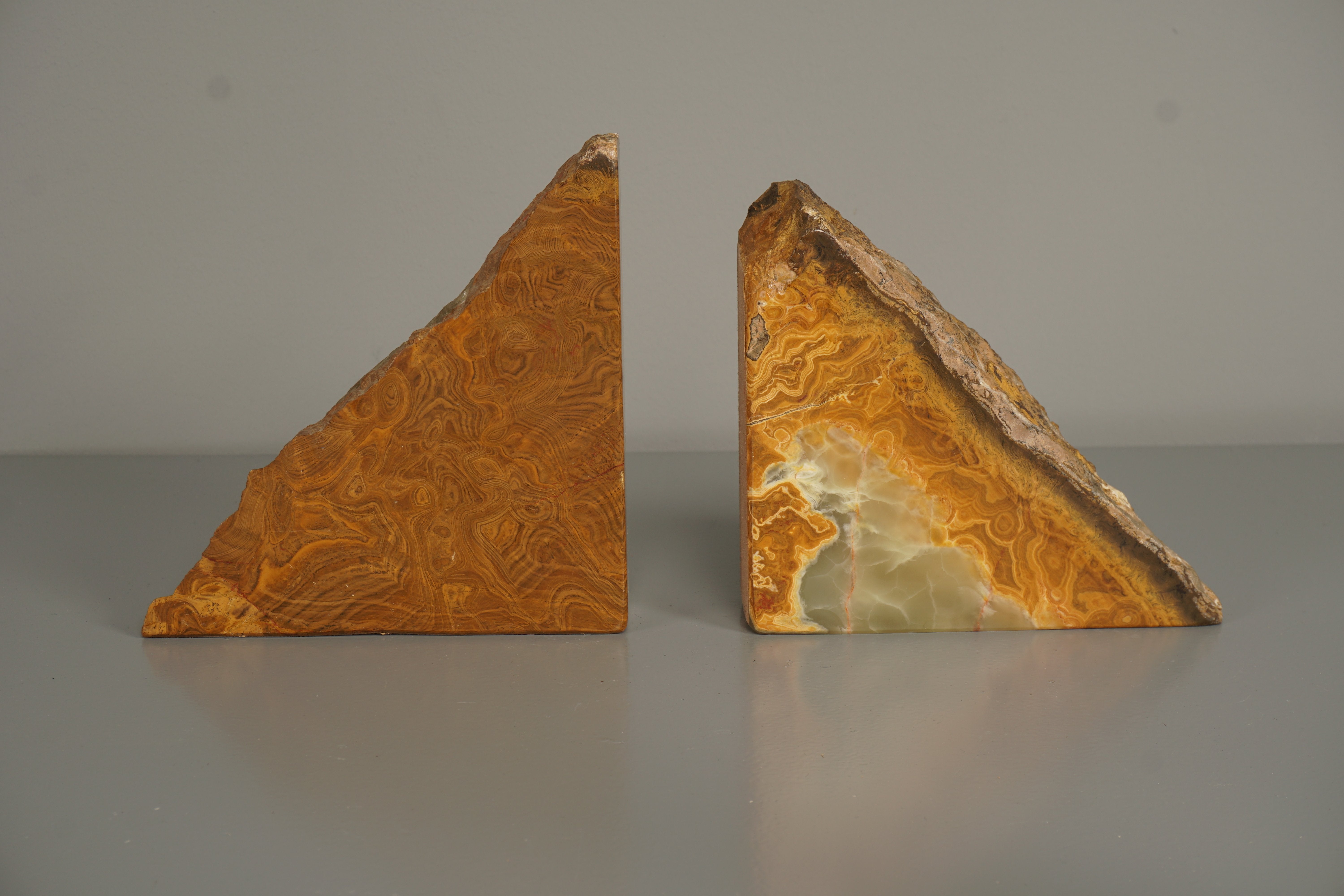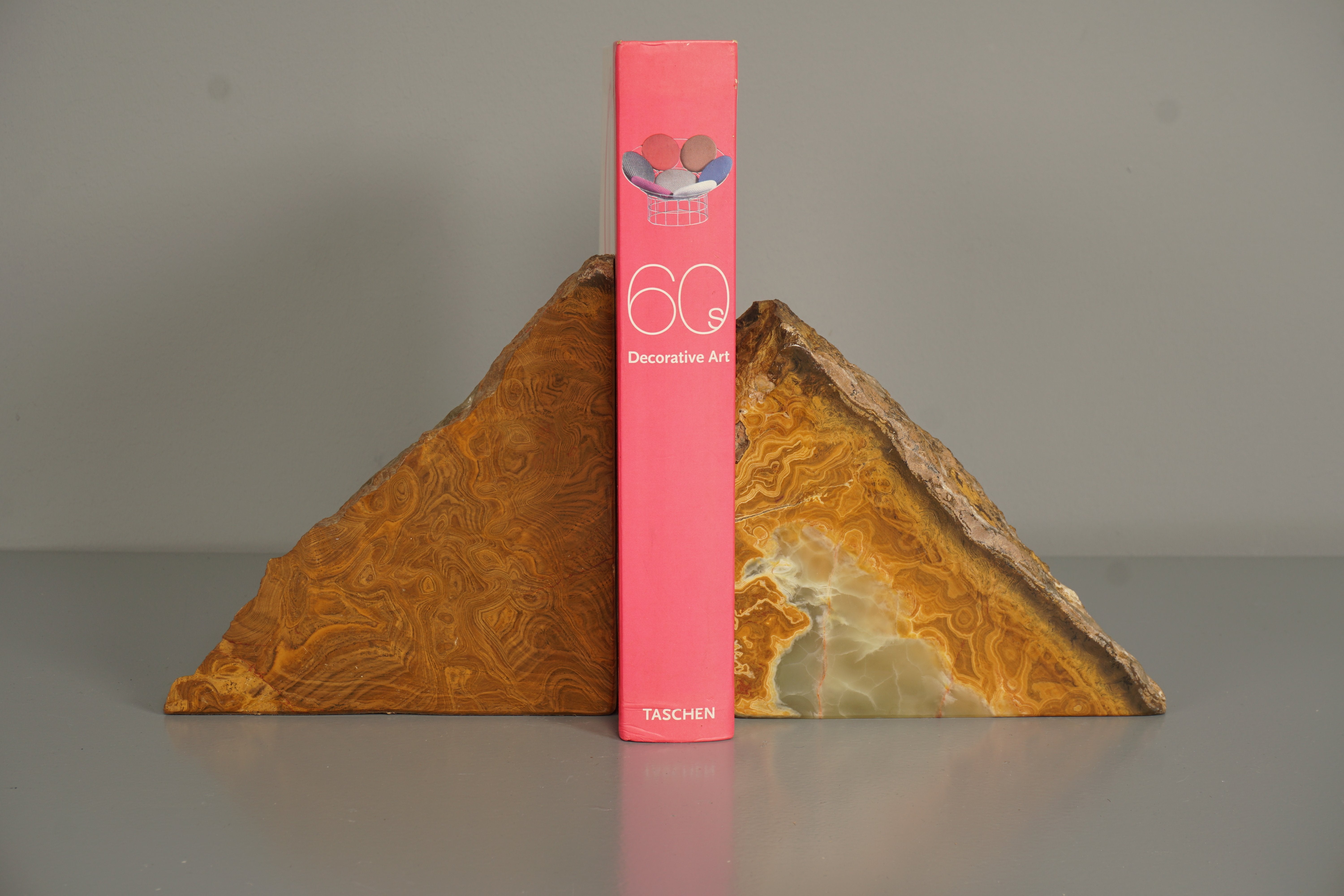 These unique bookends from the 70s are crafted from polished agate and feature a natural edge. The brown stone showcases a fascinating grain, making each piece one of a kind.