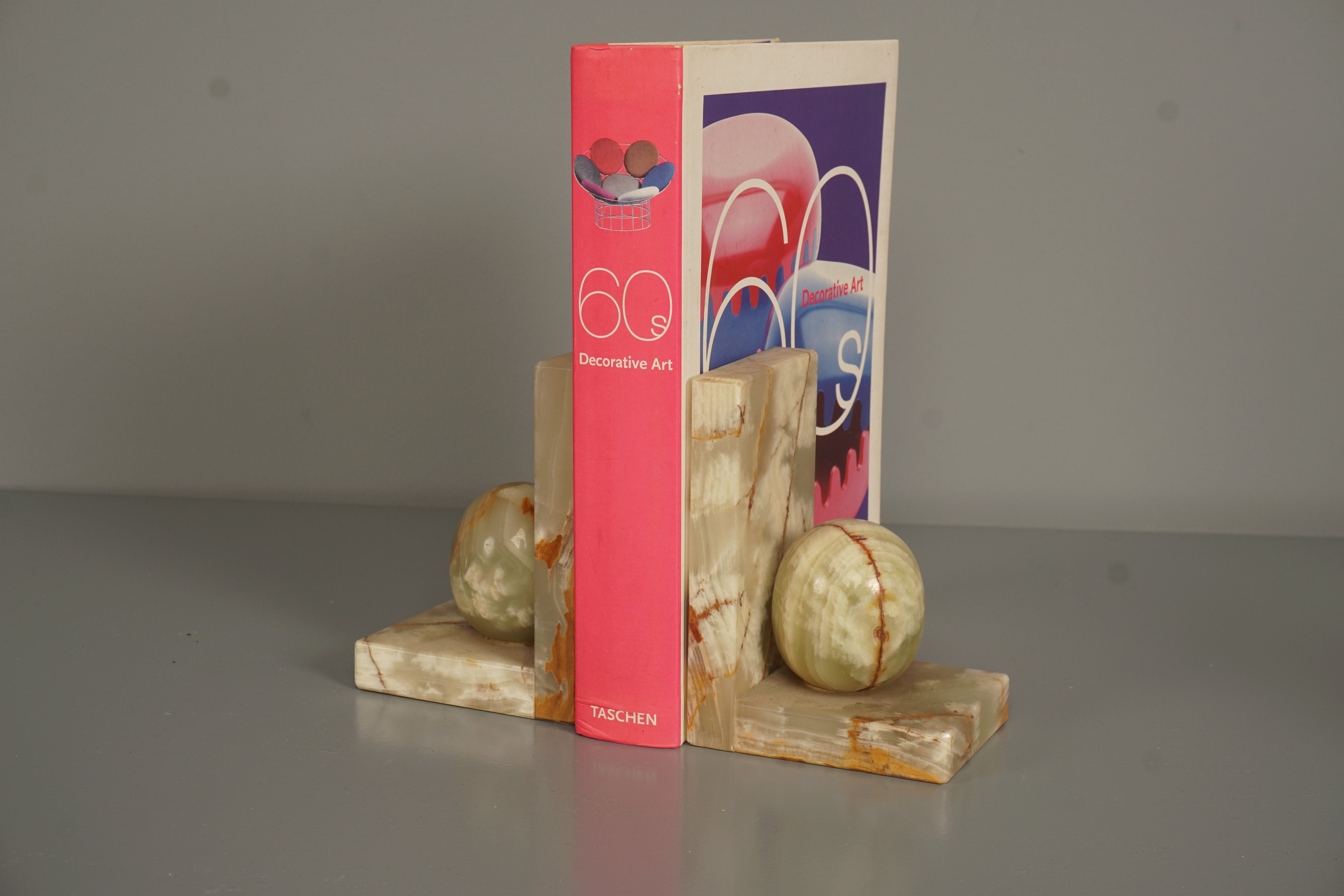 This vintage pair of onyx bookends from the 1970s is a true eye-catcher for any bookshelf. The polished surface and unique grain make them a special piece of mid-century modern decor.