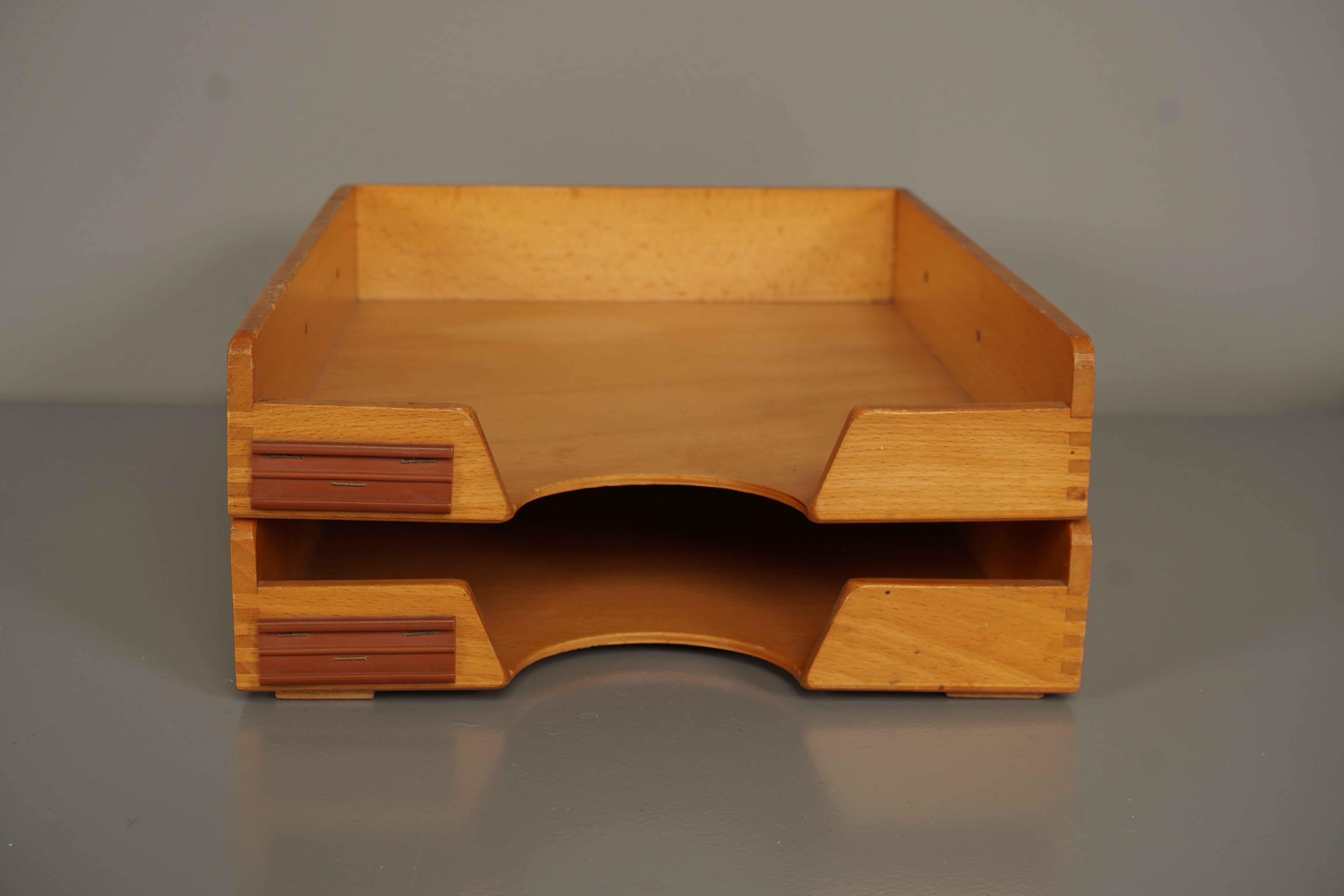 This Bauhaus desk tray from the 1950s combines wood and plastic in a stylish design. Perfect for fans of mid-century modern style.